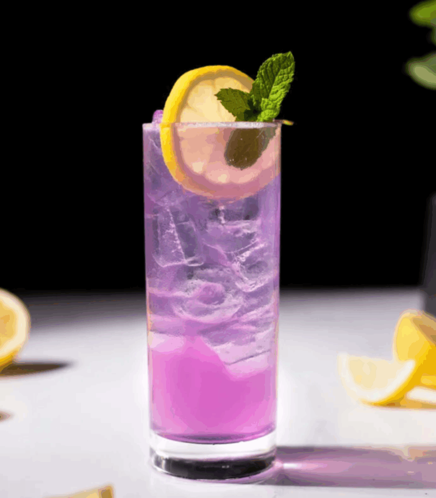 Un trago refrescante y visualmente impactante con un toque botánico, notas cítricas y un hermoso color gracias al té de flor de guisante (butterfly pea).